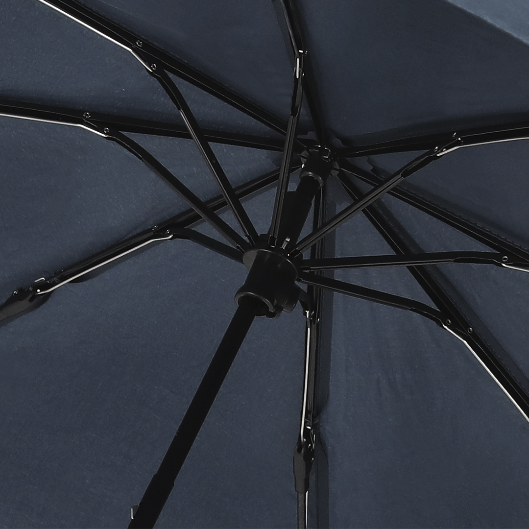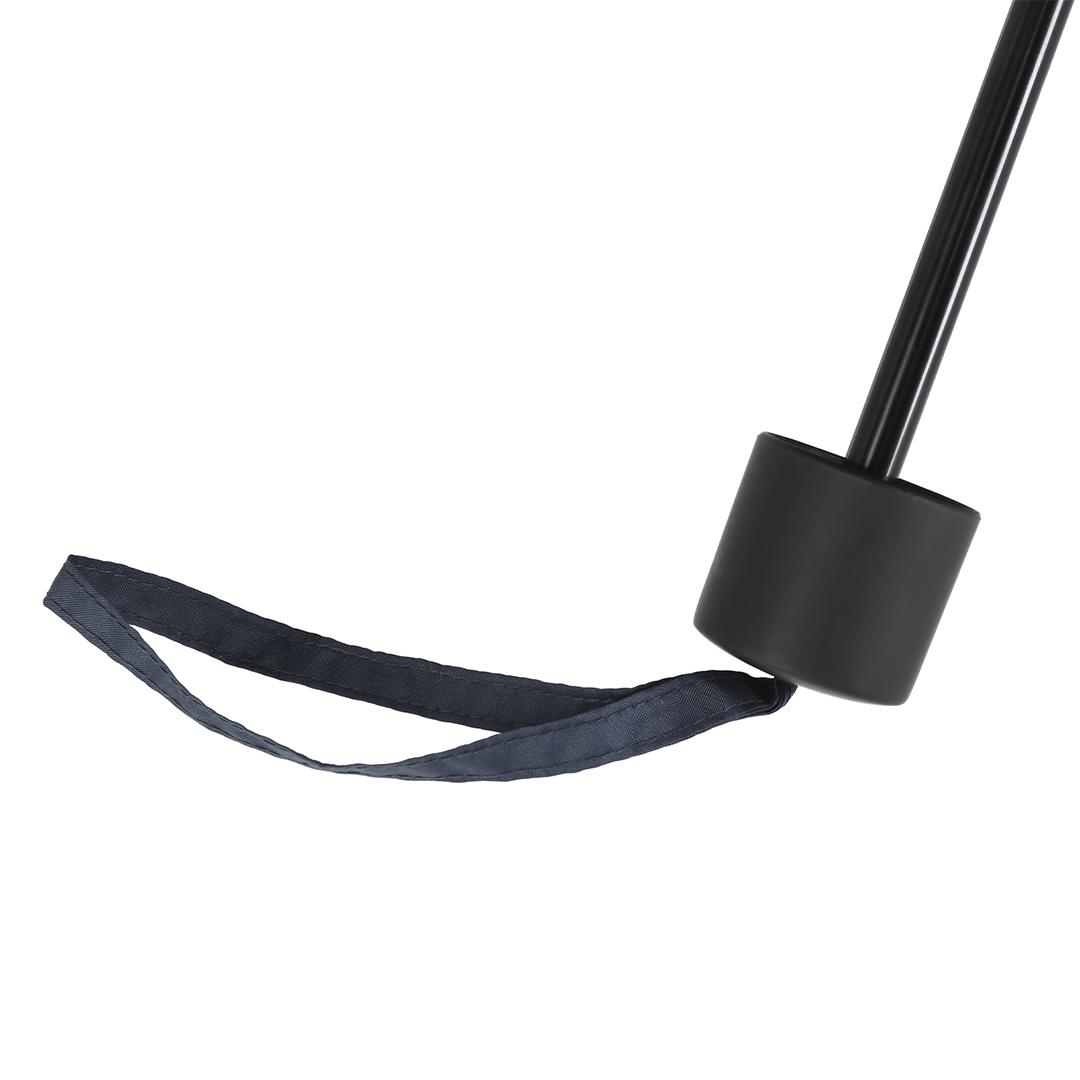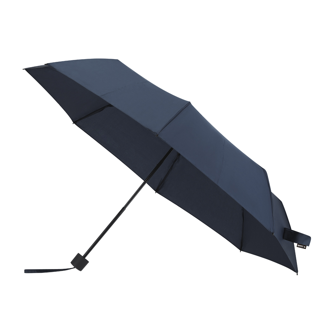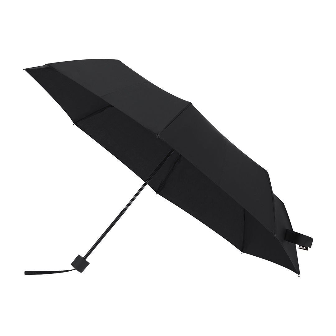 Paraguas plegable con 100cm de diámetro. En material pongee 190T RPET y mango de suave ABS negro con cinta de muñeca para mayor seguridad. De apertura manual, con sistema antiviento y varillas en fibra de vidrio en color negro. Con etiqueta distintiva RPET.